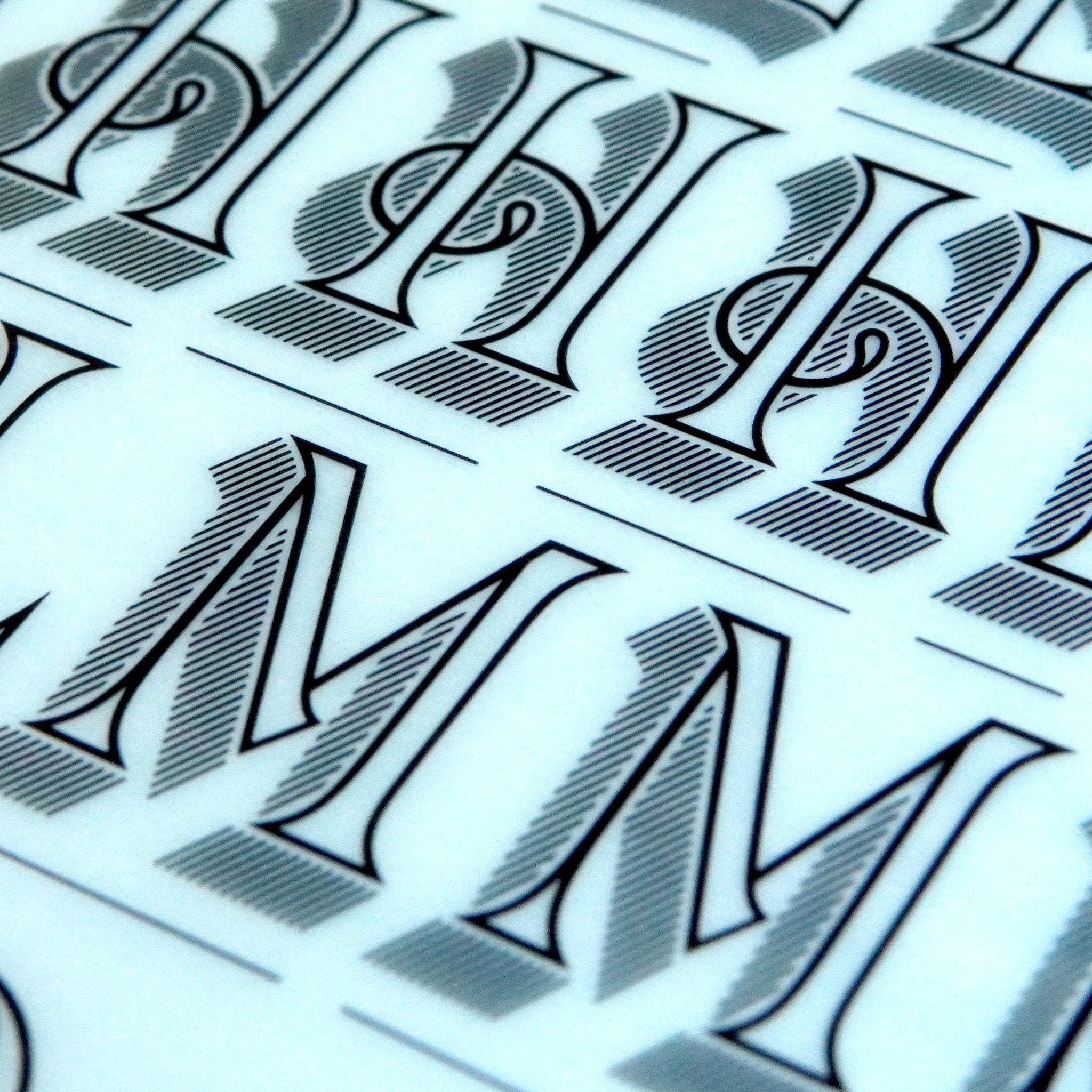 This font is called Talisman in a big 96pt size (each letter is over 2.5cm tall!) available as upper and lowercase. A quirky display face with an amazing shadow made up of thin stripes. Soft spot for the special 'Th' ligature!