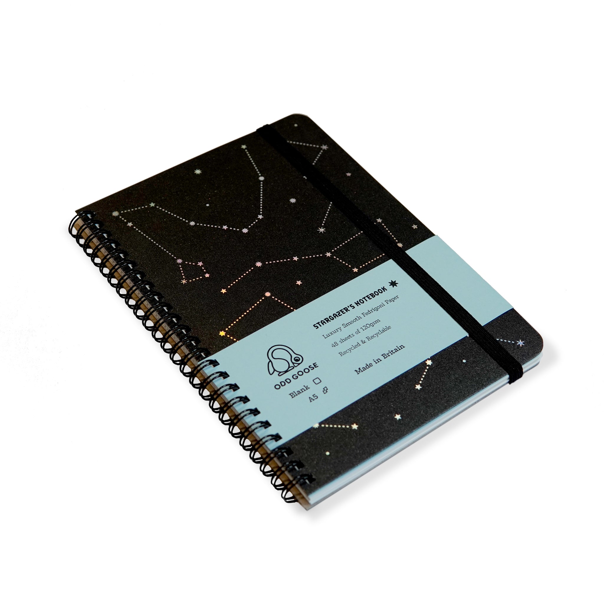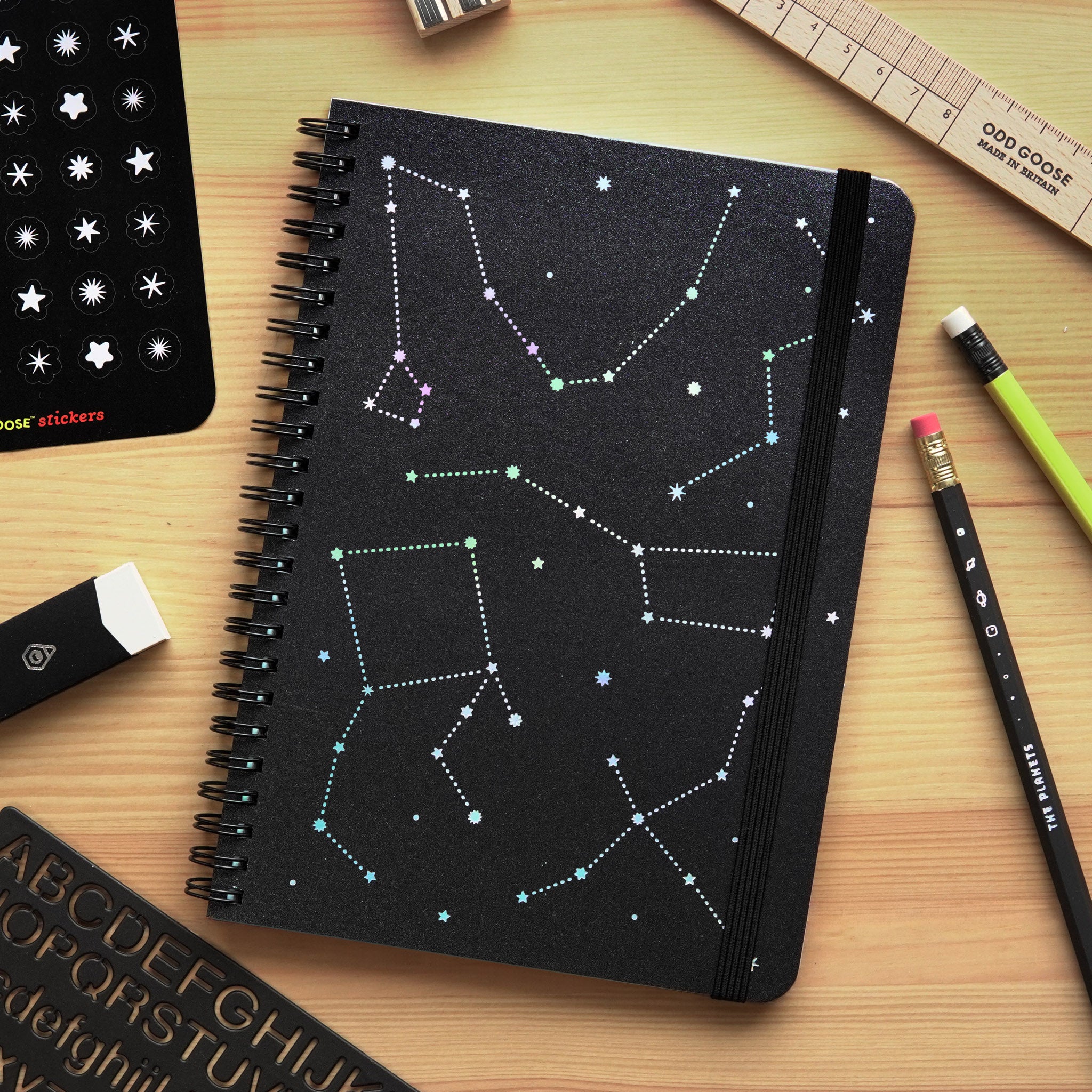 Get writing in the stars with our A5-sized Stargazer Notebook! A selection of constellations and asterisms from the night sky have been carefully printed in twinkling holographic foil onto the sparkling board cover. Can you recognise them?