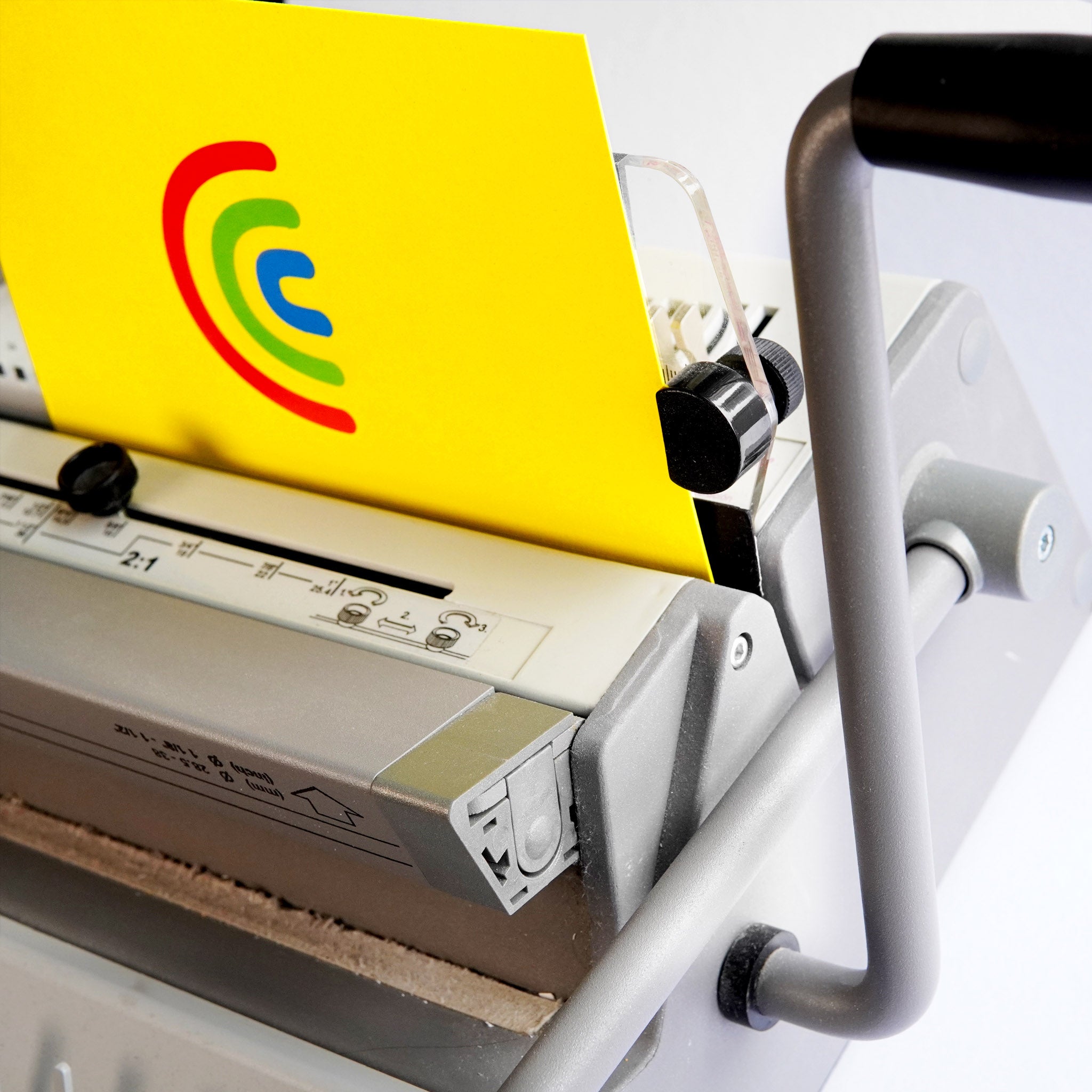 Each notebook goes through the binding machine, one little stack of sheets at a time. First the holes are punched, and then the wire spirals are squeezed in place.