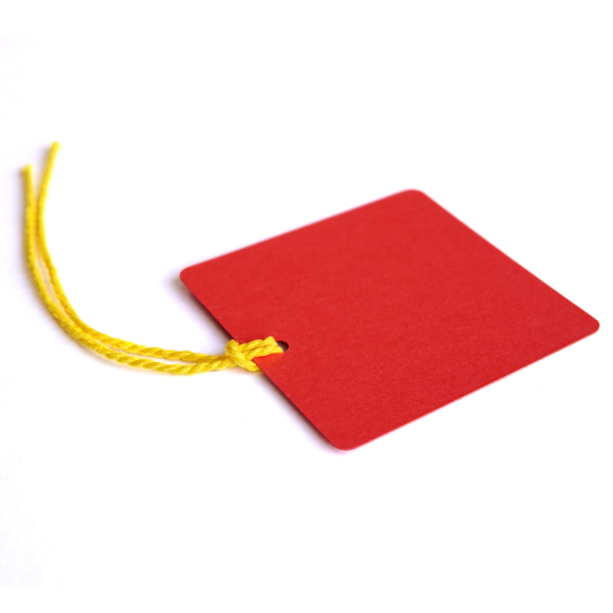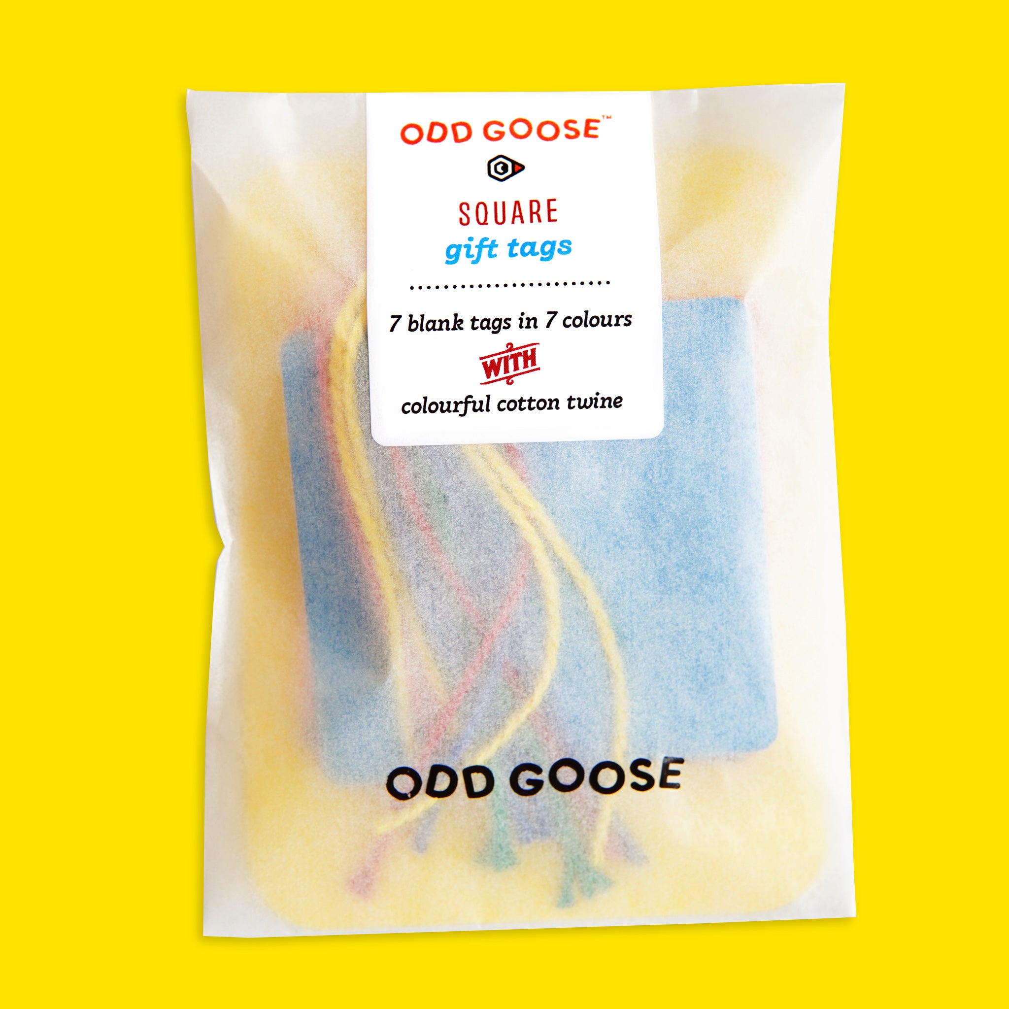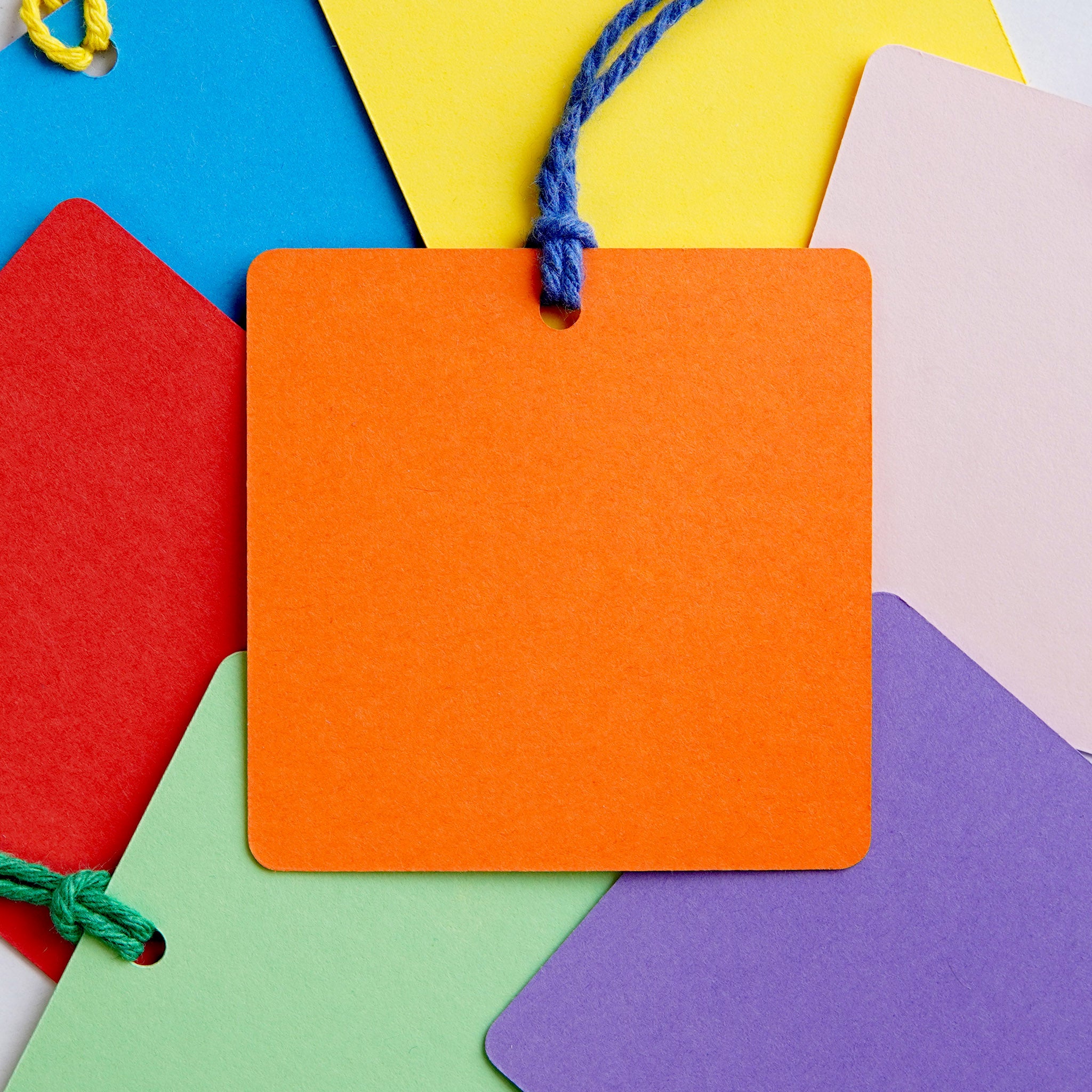 7 square shaped tags in 7 different card colours: blue, orange, yellow, red, green, pink and purple. Each tag is strung with colourful cotton twine in assorted colours (you can even mix and match your own colour combinations!)